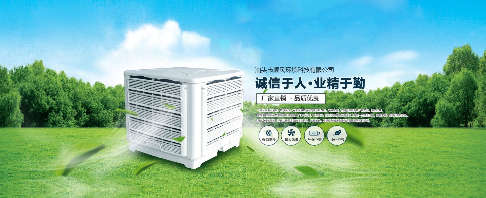 汕頭市順風環境科技有限公司,是一家專注從事廢水治理,廢氣治理,中水回用和給水凈化環境工程,中央空調、節能環保空調和廠房車間、溫室花卉、家禽畜牧等場所的節能通風降溫及工廠廢氣處理、環保除塵、污水處理的技術型企業,擁有一支技術過硬、經驗豐富,思想創新的團隊,為客戶提供節能、環保工程等方面的項目研究、工程設計、環保設備制造安裝和運營管理等系列服務。 多年來,公司堅持 “ 誠信于人,業精于勤” 的宗旨,憑借豐富的工作經驗及雄厚的技術實力為多家大型公司、工廠、養殖、超市等大型綜合場所進行節能通風降溫及廢氣處理、污水處理等工程設計、安裝、維修、年度保養,得到了顧客的一致好評并長期合作。